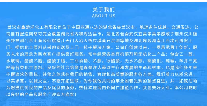 武漢市鑫楚洋化工有限公司位于中國四通八達的湖北省會武漢市,地理條件優(yōu)越,交通發(fā)達,公司自有配送網(wǎng)絡可完全覆蓋湖北省內(nèi)和周邊縣市。提供化工原料從采購到送貨上門一攬子解決方案。公司自創(chuàng)建以來,一貫秉承勇于創(chuàng)新,服務未來的理念為新老客戶提供良好服務。
